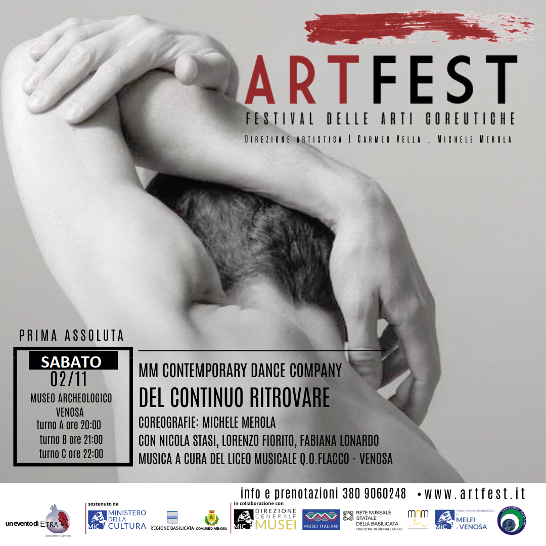 • Il 2 novembre, presso il Museo Archeologico Nazionale “M. Torelli” di Venosa, prima assoluta dello spettacolo DEL CONTINUO RITROVARE (comp. MM CONTEMPORARY DANCE COMPANY), che si snoderà lungo il percorso espositivo (turno A, ore 20.00; turno B, ore 21.00; turno C, ore 22.00)
