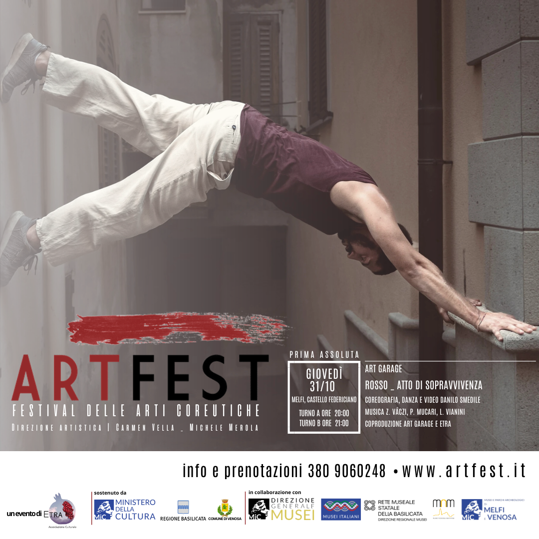 • Il 31 ottobre, presso il Museo Archeologico Nazionale “M. Pallottino” di Melfi, si potrà assistere alla prima assoluta di ROSSO – ATTO DI SOPRAVVIVENZA (comp. ARTGARAGE), spettacolo che chiude un periodo di residenza artistica di due giorni (turno A, ore 20.00; turno B, ore 21.00);